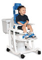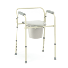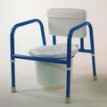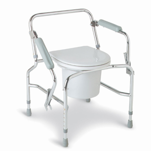 It folds up in seconds for storage or to transport and comes with arm rests, angled legs for stability, non-marking ruber tips, anti-rattle collars that reduce noice, snap-on removable back, pail, splash shield and lid.